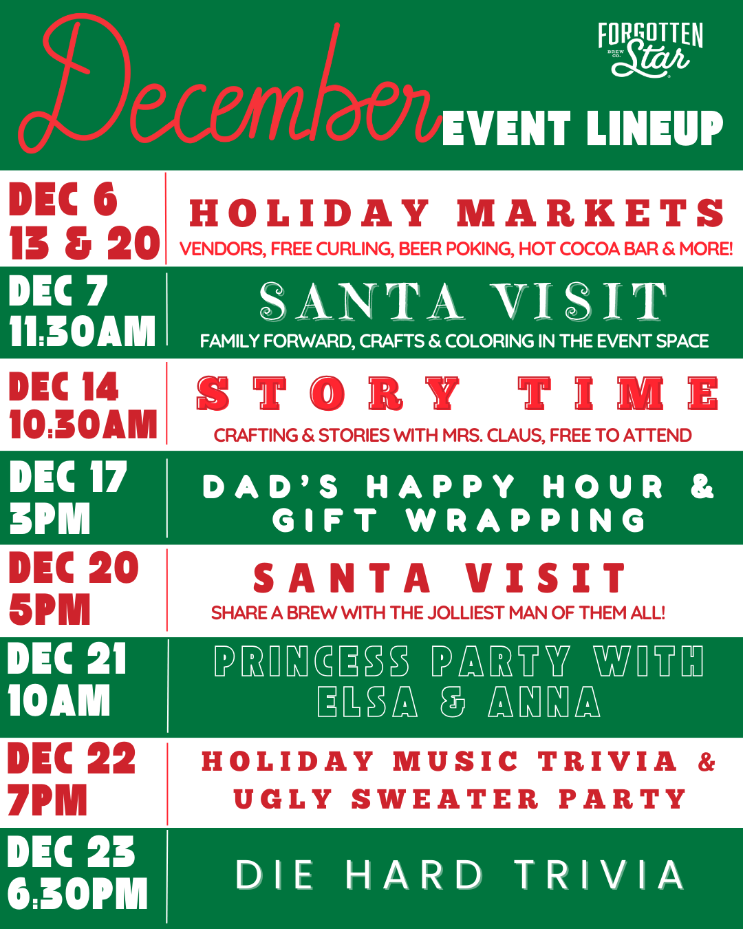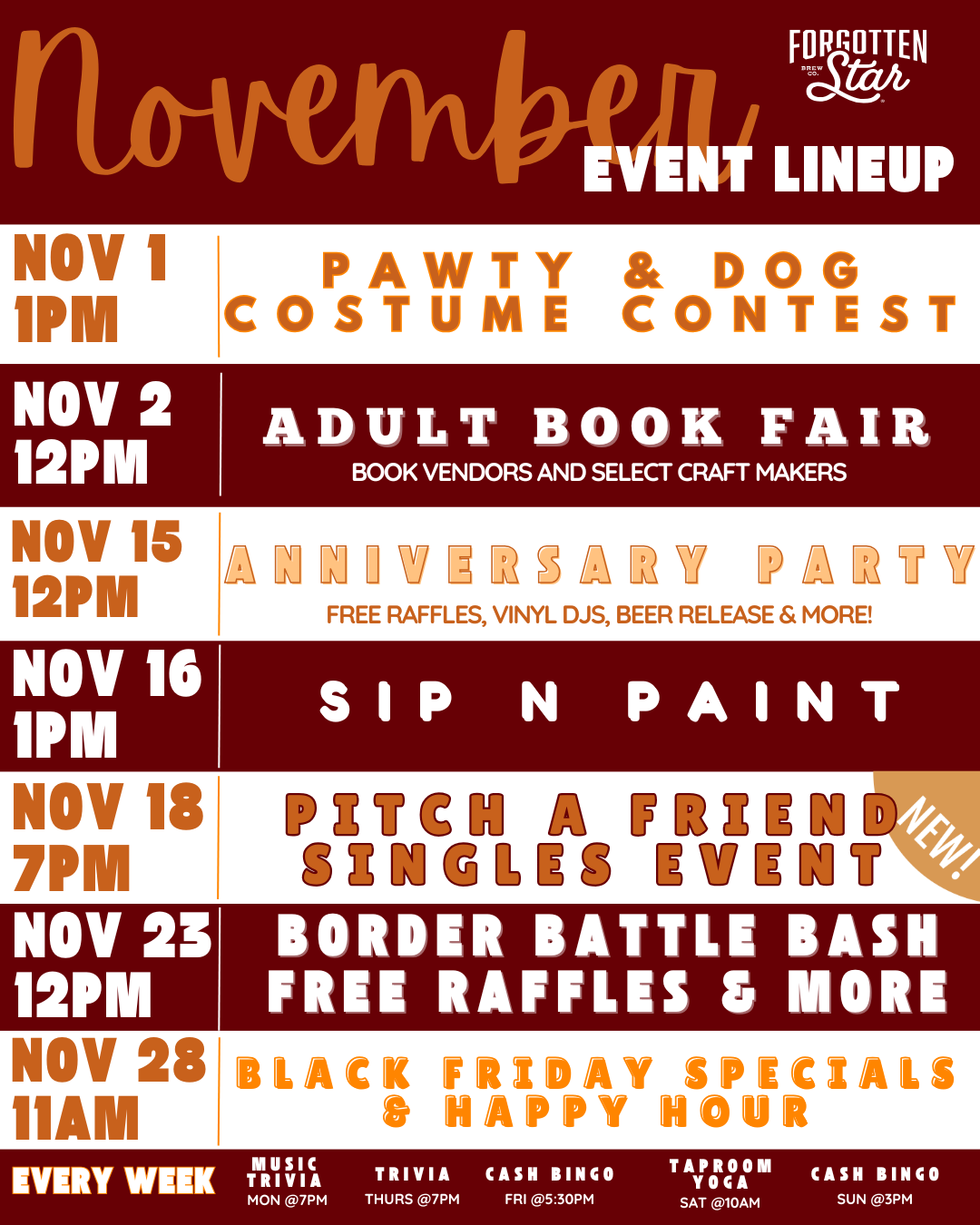 Let Forgotten Star Brewing Company elevate your next event with our exceptional craft beer and catering partnerships. Whether you're hosting a corporate gathering, wedding, birthday party, or any special occasion, we'll help make it unforgettable with great brews and delicious food.